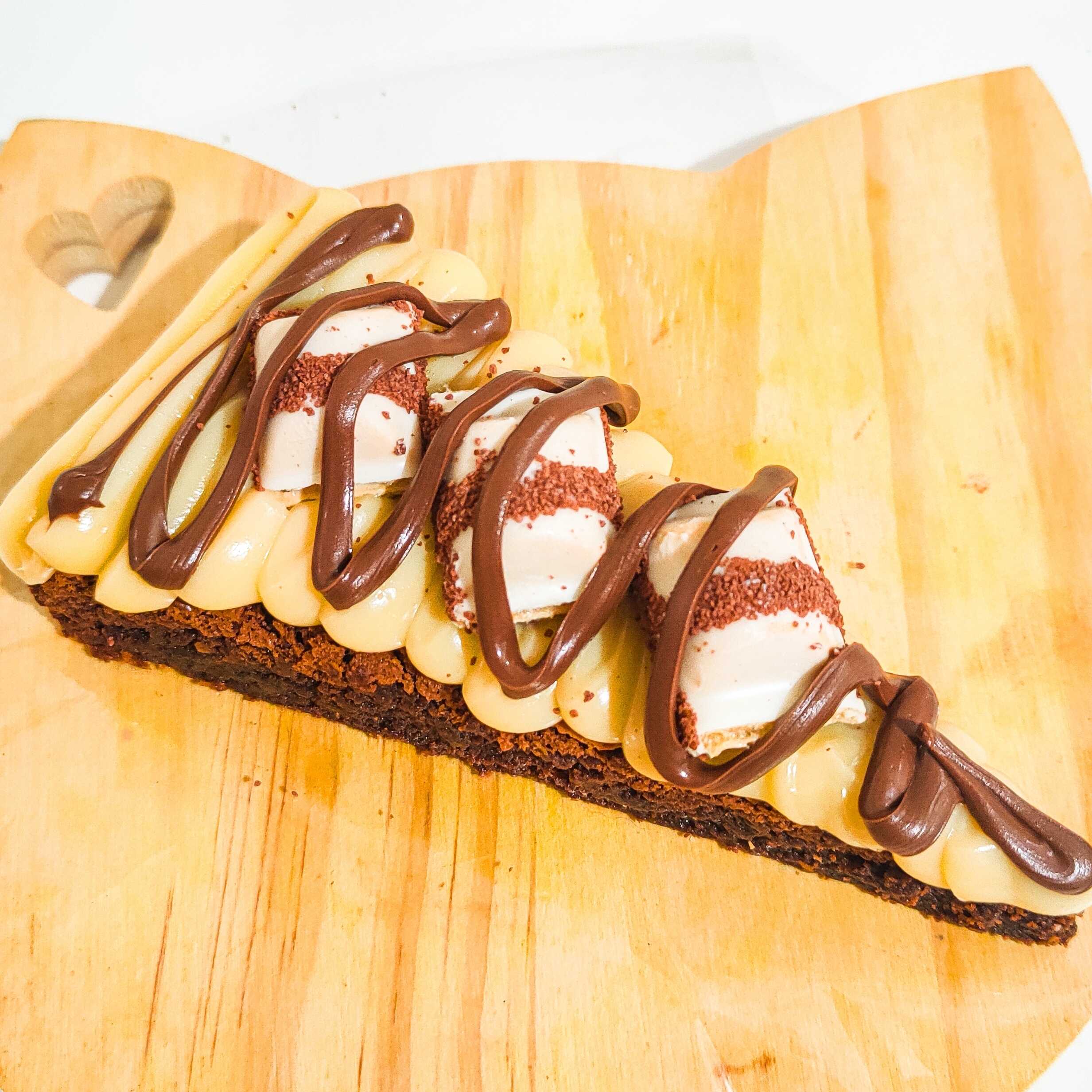 Uma super fatia do nosso brownie chocolatudo, coberto com nosso creme de Ninho delicioso, finalizado com Nutella, Kinder bueno (podendo variar branco ou ao leite conforme disponibilidade)