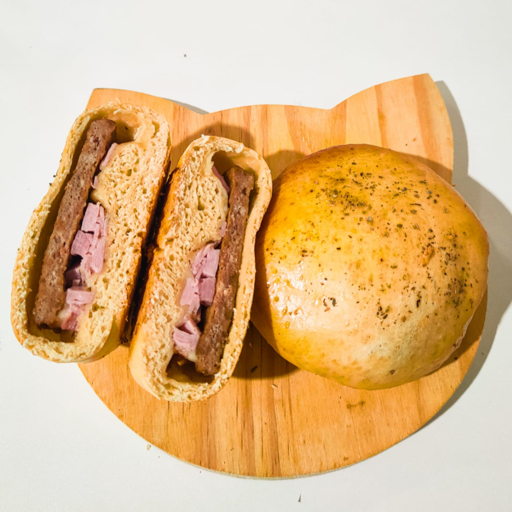 Salgado assado, feito com massa artesanal muito saborosa, recheado com hamburguer, queijo, presunto e oregano.