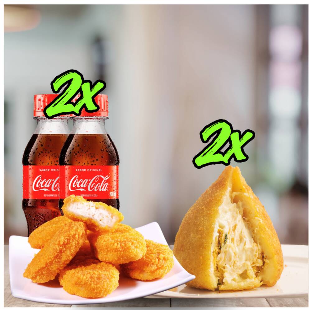 Pra curtir juntinhos - São 2 coxinhas de frango com requeijão, 10 nuggets crocantes e 2 refri pet de 200ml pra acompanhar. Lanchinho a dois cheio de sabor e economia. ----------Tags------------ bolo , bolo no pote , pote , sobremesa , doce , prestigio , chocolate , brigadeiro , gourmet , cupom , desconto , taxa grátis , entrega grátis , confeitaria , mousse , salgado , coxinha , risoli , creme , limão , combo , bolo vulcão , cenoura , artesanal , caseiro , amendoim , paçoca , cappuccino , entrega rápida , desconto , promoção , 0,99 , 0800 , off , barato , melhor preço , oferta , frete grátis , descontão , preço baixo , refri , galera , pavê , ganache , casal Serve até 2 pessoas