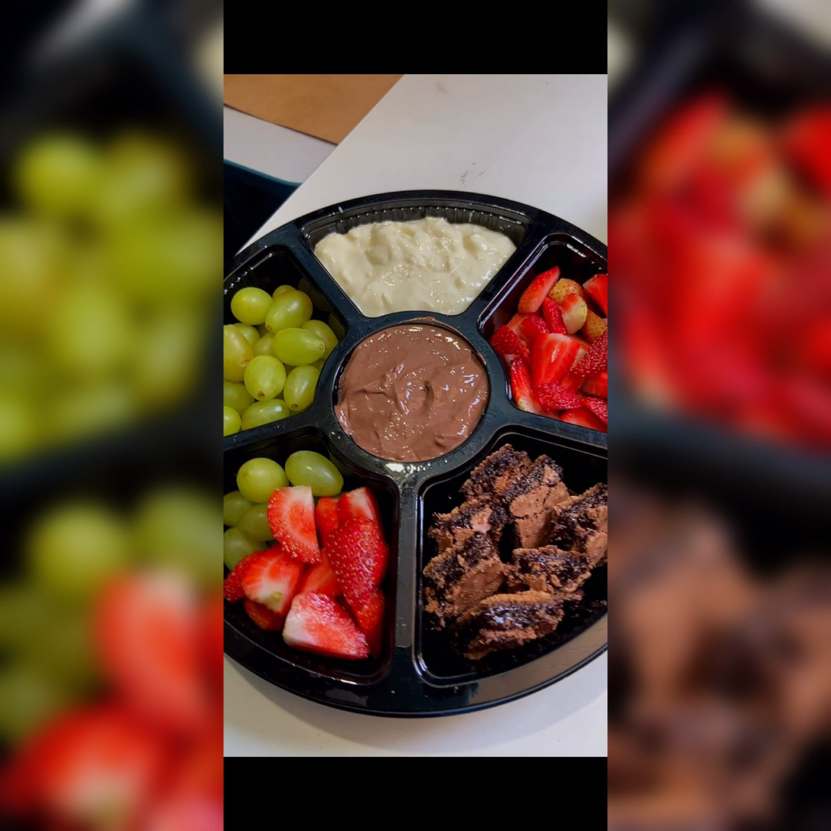 1 travesa de uva verde com creme de chocolate e creme ninho com granulado e 1 travessa de morango com creme ninho e creme de chocolate e granulado.