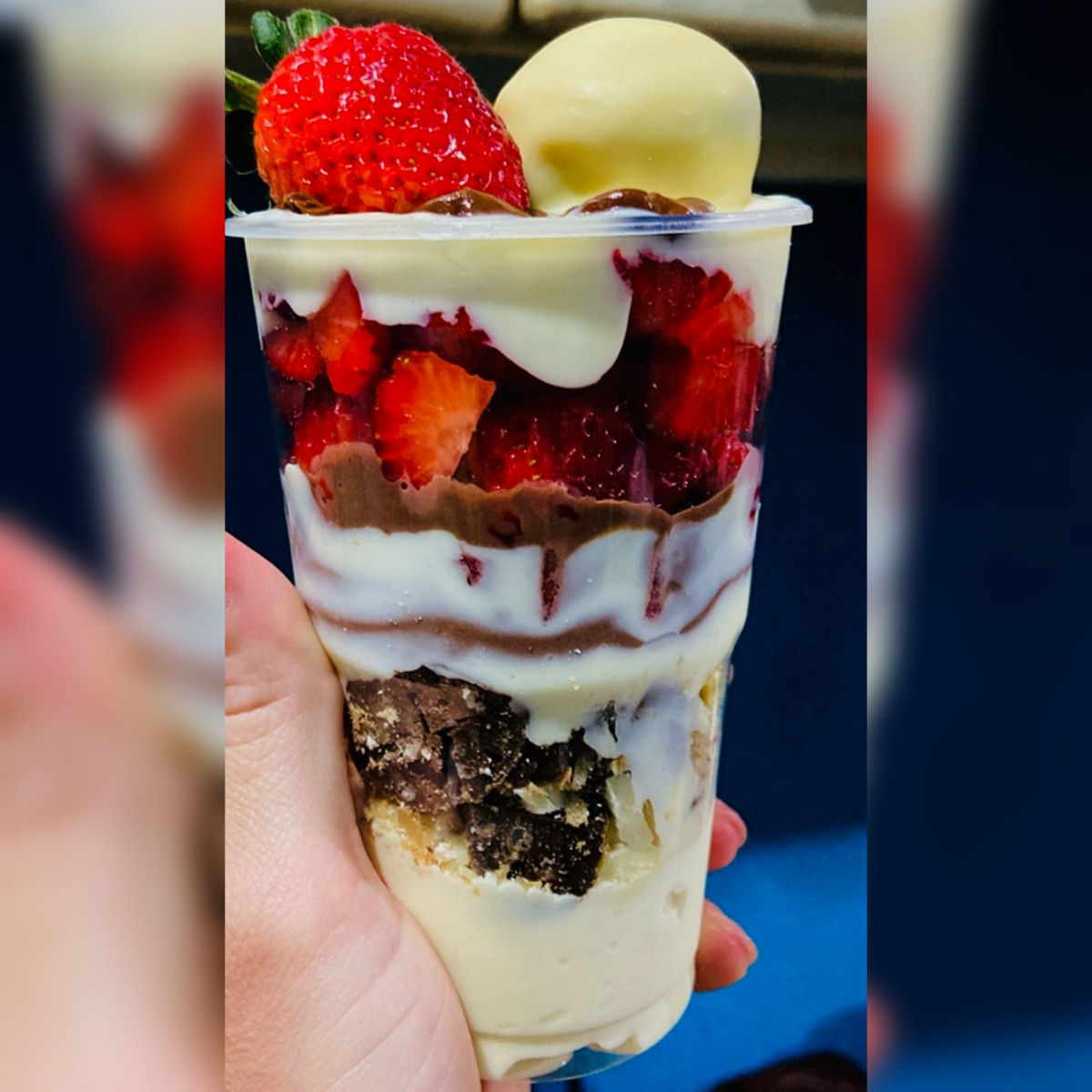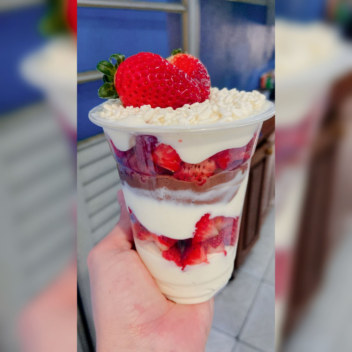 Creme de chocolate, creme ninho, morango e granulado.