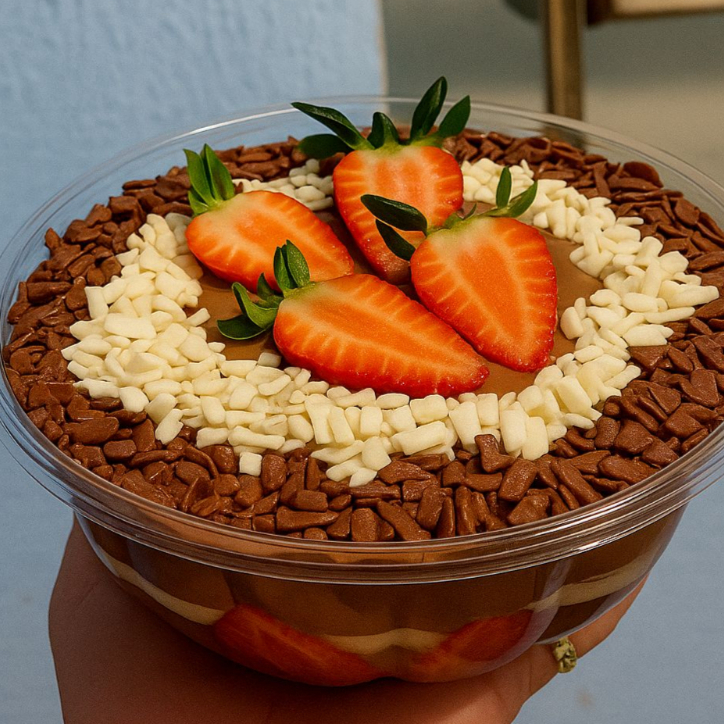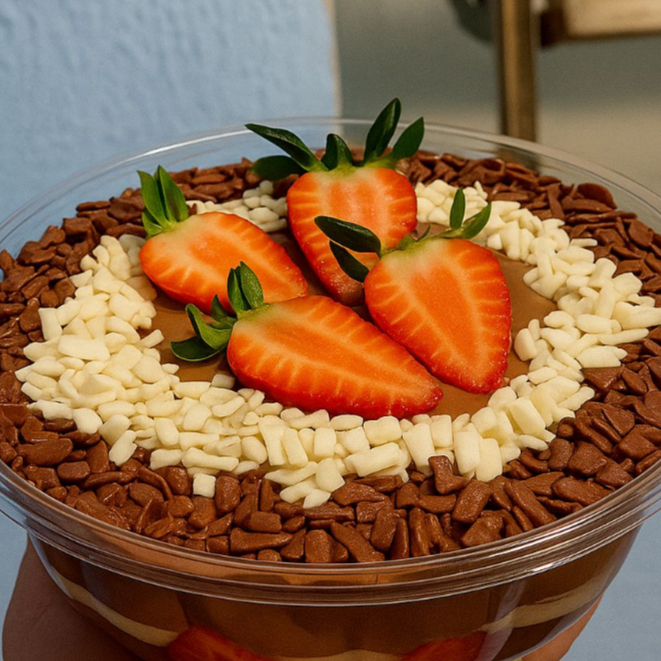 sobremessa na traves, puro morango creme ninho creme chocolate decoraçcao especial granulado em flocos branco e preto