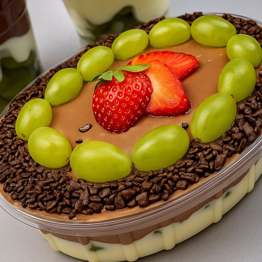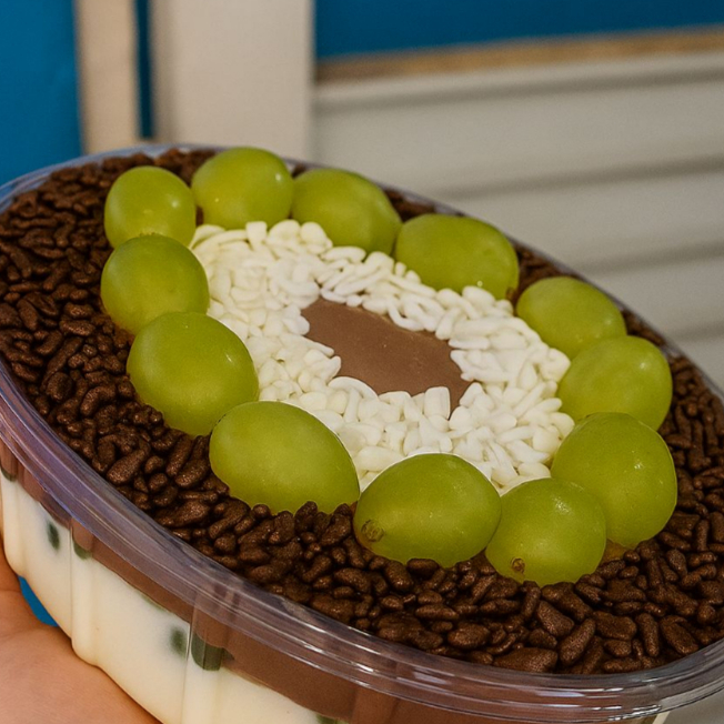 Creme de chocolate, creme ninho com uva verde e granulado.