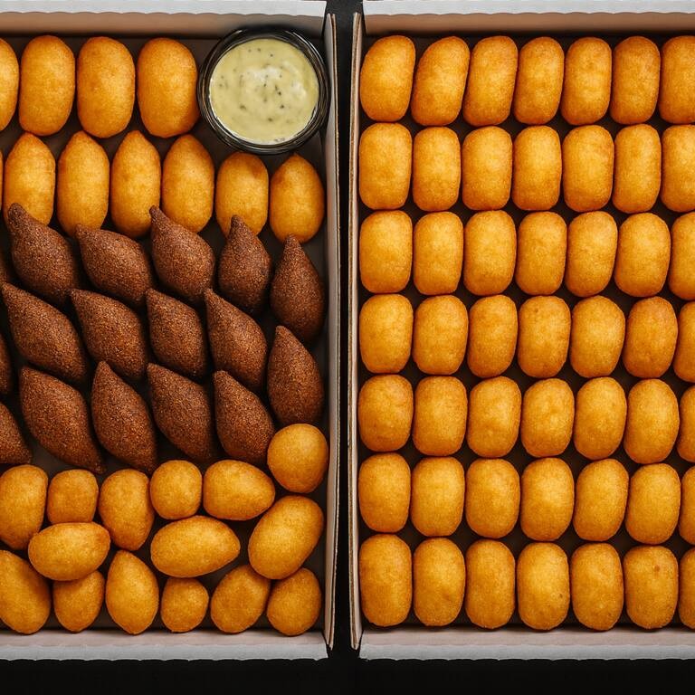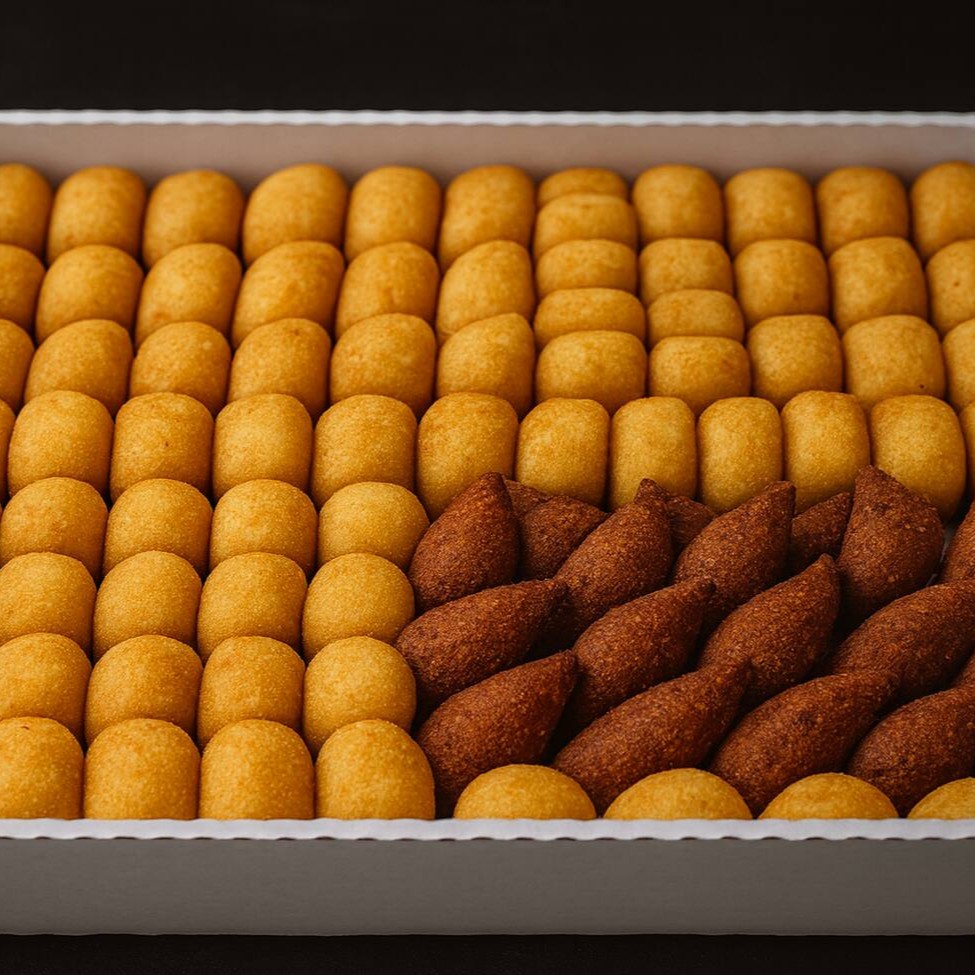 150 salgadinhos de festa mistos Serve bem 13 pessoas - Apresentamos o 'Meu Salgado Favorito', ideal para compartilhar em momentos especiais. São 150 unidades de salgados de festa, com uma massa com batatas indescritivelmente saborosa, super recheados. Todos sequinhos, crocantes e fritos na hora, garantindo a máxima qualidade. O combo inclui: • 25 coxinhas de frango; - 25 bolinhas de queijo; - 25 rissoles de carne; - 25 enroladinhos de salsicha; - 25 croquetes de calabresa; - 25 kibes;