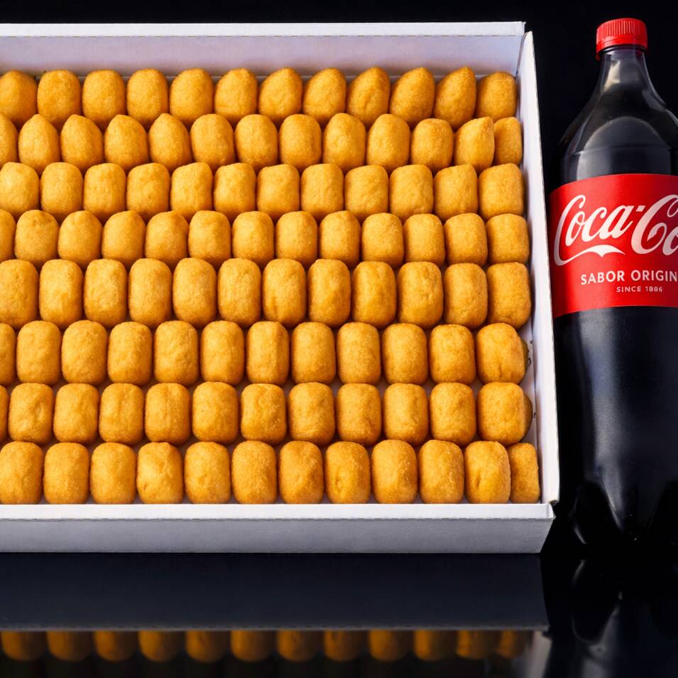 Serve bem 6 pessoas - 75 salgadinhos mistos da sua escolha até 3 sabores + 1 Coca Cola 2 litros normal ou zero, com uma massa deliciosa com batatas super recheados sequinhos e crocantes feitos na hora! Serve até 7 pessoas