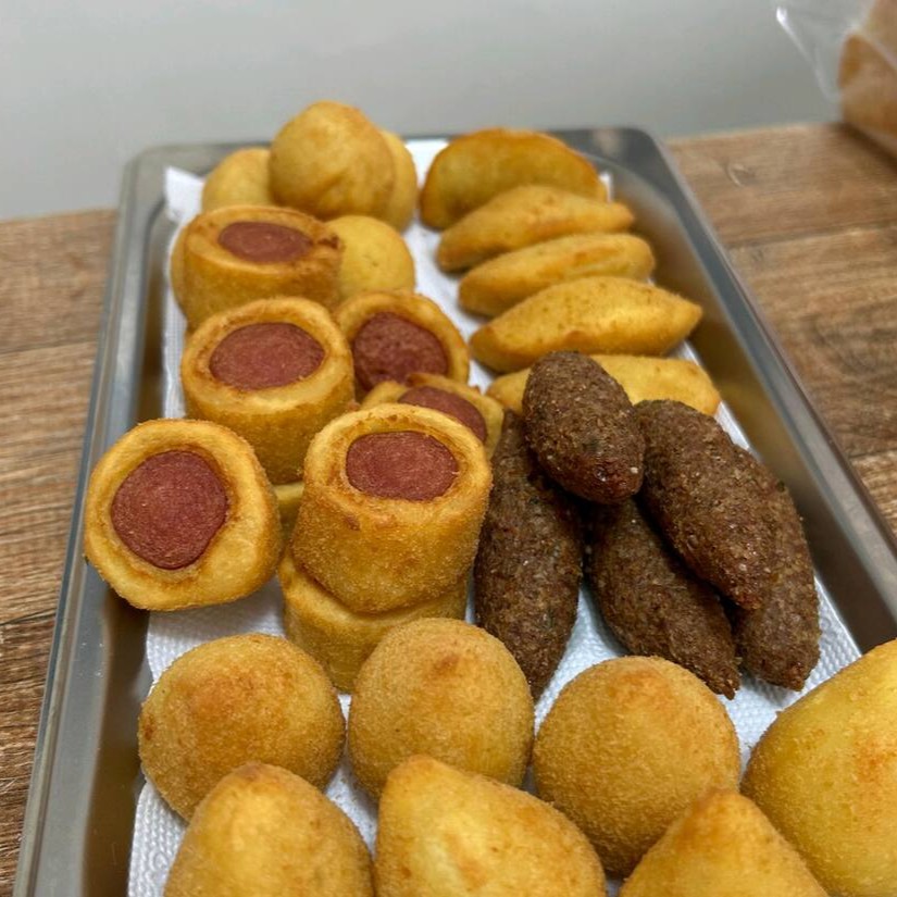 Porção com 20 unidades, sendo os sabores kibe, coxinha, bolinha de queijo, e risoles de carne.