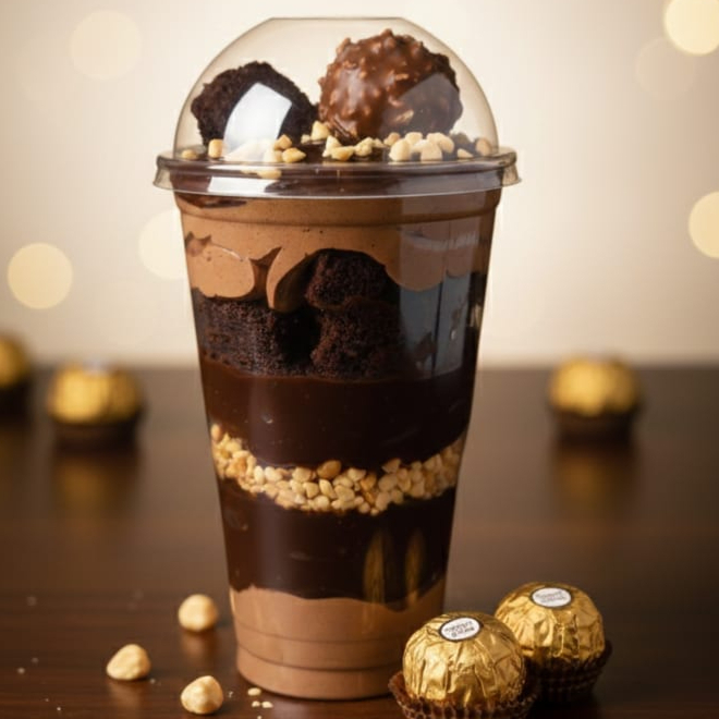 Simplesmente luxuoso. Quando a felicidade é servida em um copo, camadas de brigadeiro com mousse de chocolate amendoim um delicioso brownie e o rei ferrero rocher. #CopoDaFelicidade #FerreroRocher #Sobremesa #DoceGourmet #Confeitaria #Chocolate #Avelã #Instafood #FoodPorn #Indulgência o e tem sabor de Ferrero Rocher.