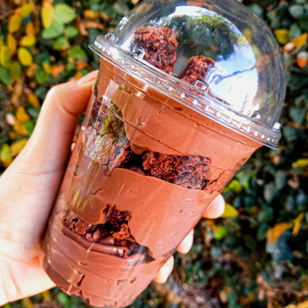 Para quem ama a intensidade do chocolate - camadas intercaladas de Brownie com casquinha, creme de chocolate 50% cacau e pedacinhos de chocolate Blend.