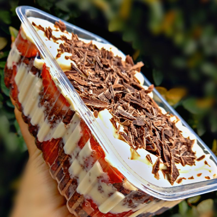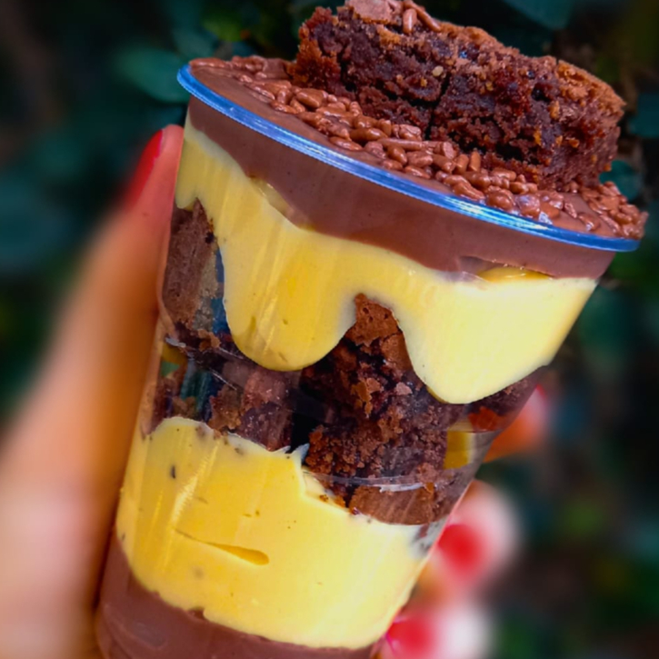 Camadas intercaladas de creme de leite ninho, btownies, mousse de ninho creme de chocolate e Morangos frescos finalizado com nutella.