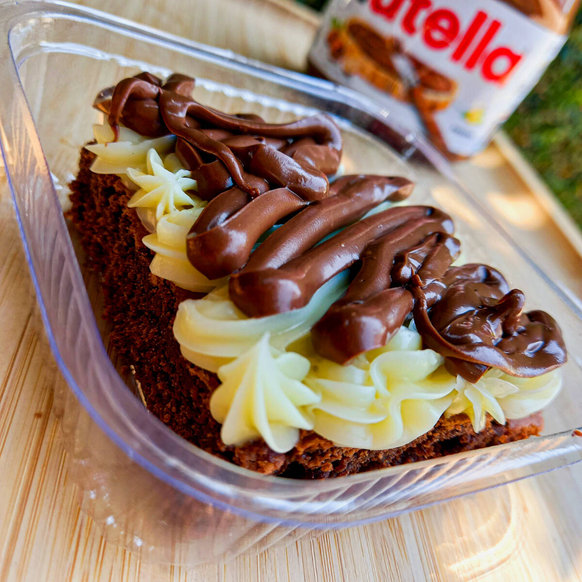 Dois pedaços de Bownie, com casquiha e cremoso por dentro, recheado com creme de leite Ninho e nutella