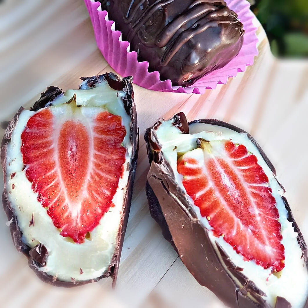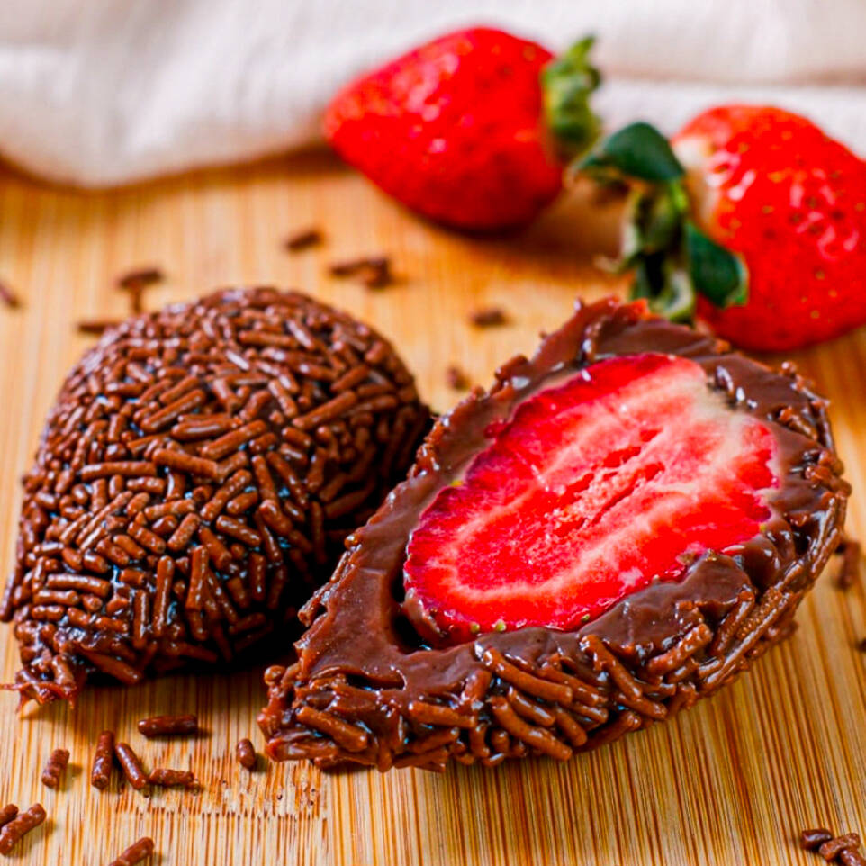 Brigadeiro de Nninho, um morango suculento, com casquinha de chocolate Blend