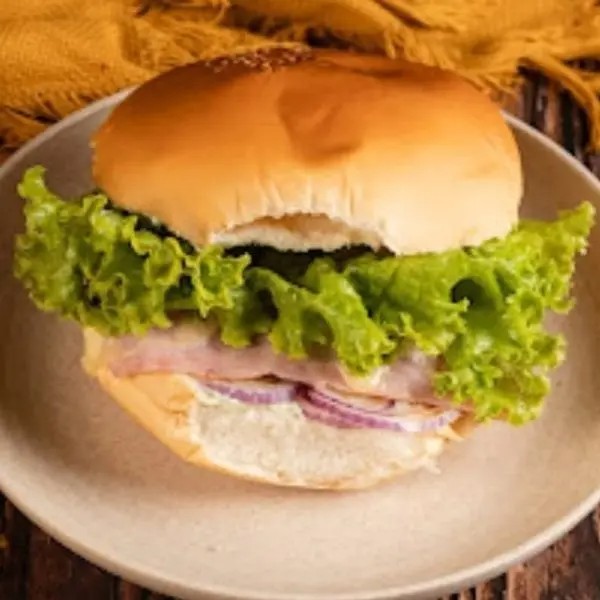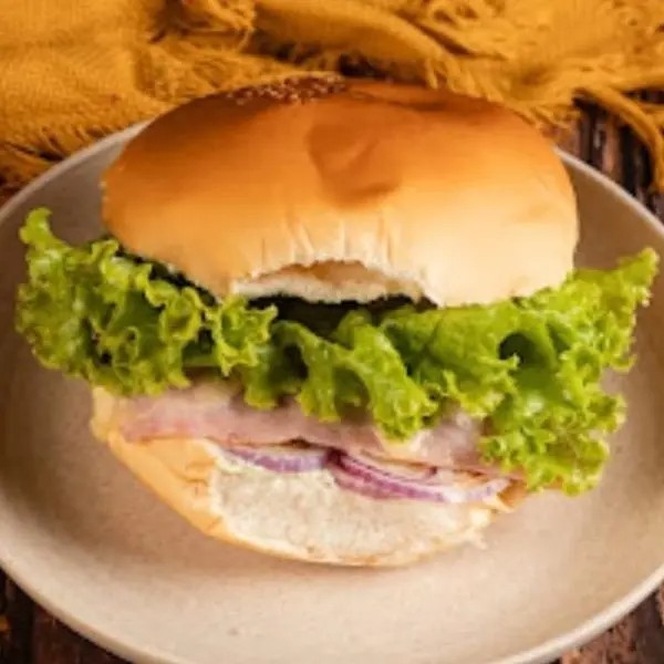 Pão Tostado na Chapa, Hambúrguer, Bacon, Maionese Caseira, Queijo Mussarela, Presunto, Tomate, Cebola, Alface.