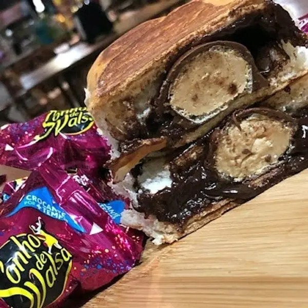 Pão macio, 22 cm, chocolate preto, bombom sonho de valsa dentro do seu dog.