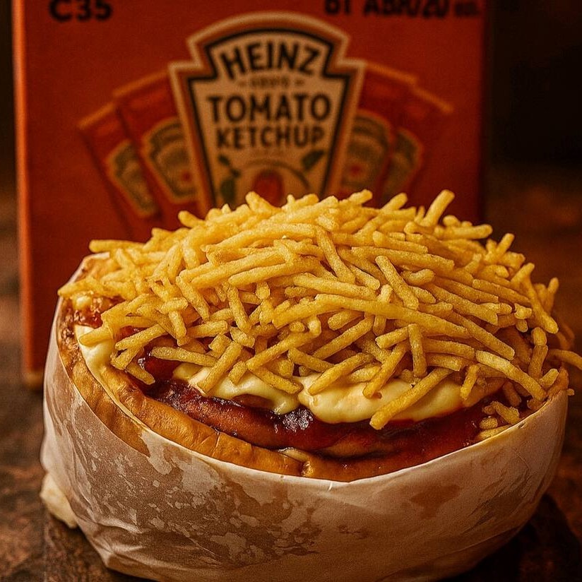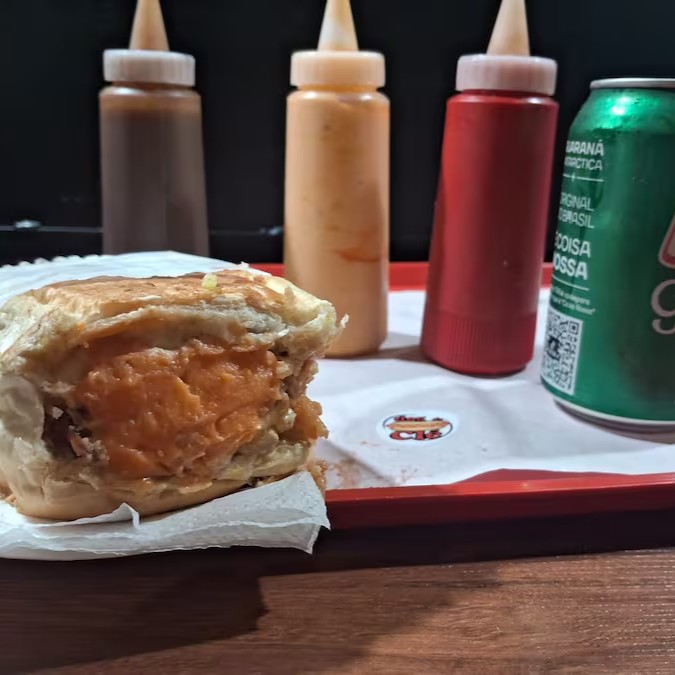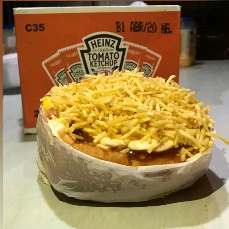 Carnes: Frango desfiado, Bacon, Calabresa, para finalizar ketchup, mostarda, maionese Hellmanns e batata palha.