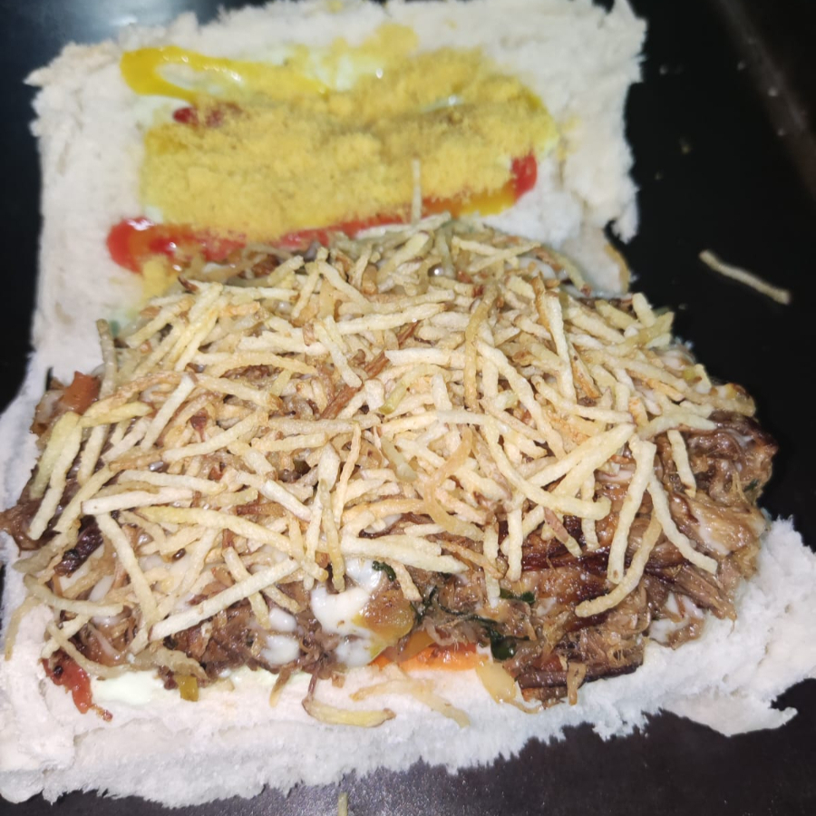 Pão,1 vina, nossa deliciosa maionese caseira, catchup, farofa, milho, tomate, cebola, pimentão,cenoura e batata palha