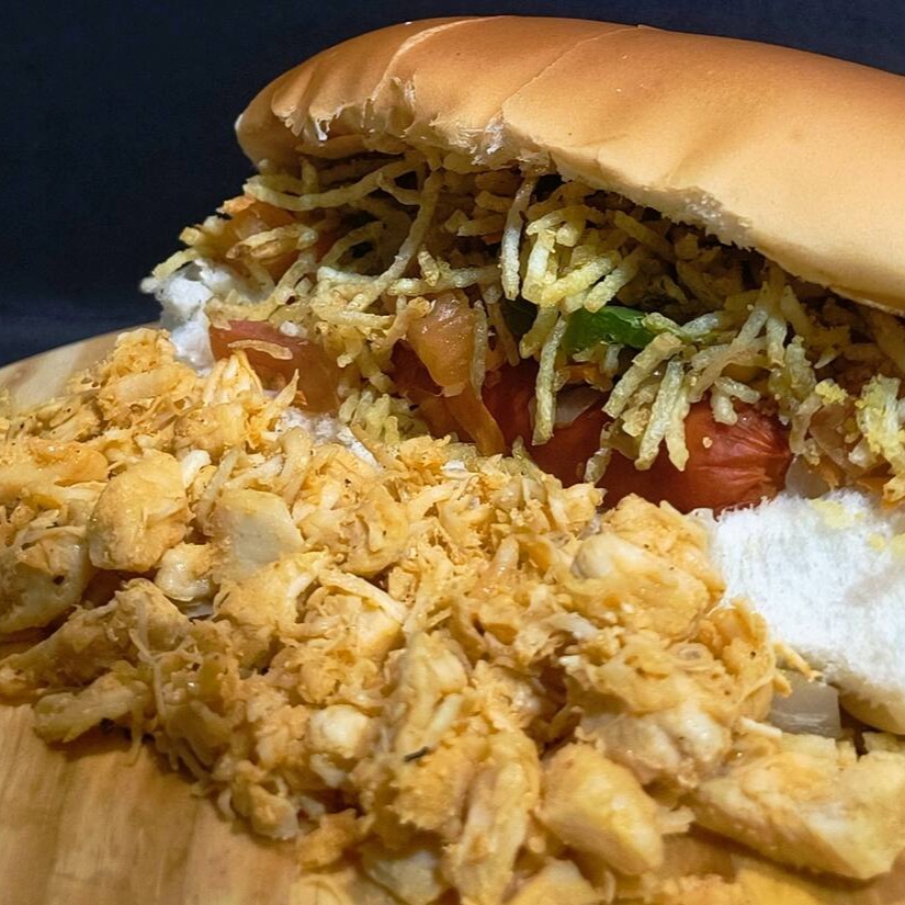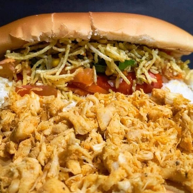 Pão,1 vina,frango em cubos, nossa deliciosa maionese caseira, catchup, farofa, milho, tomate, cebola, pimentão,cenoura e batata palha