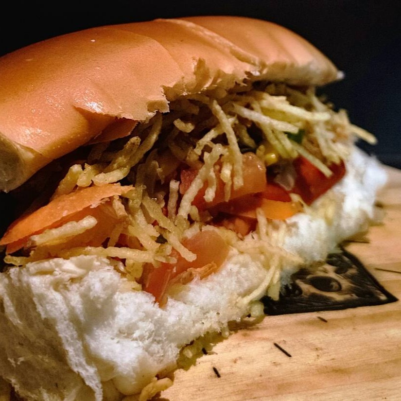Pão,1 vina, nossa deliciosa maionese caseira, catchup, farofa, milho, tomate, cebola, pimentão,cenoura e batata palha