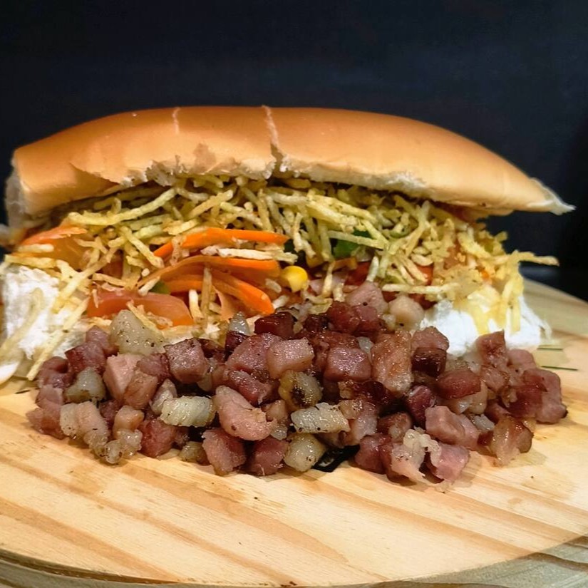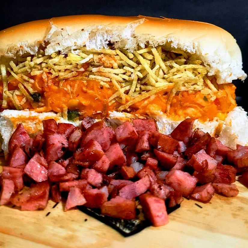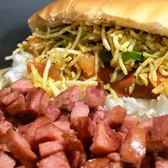 Pão,2 vinas,bacon em cubos,(cheddar Catupiry),nossa deliciosa maionese caseira, catchup, farofa, milho, tomate, cebola, pimentão,cenoura e batata palha