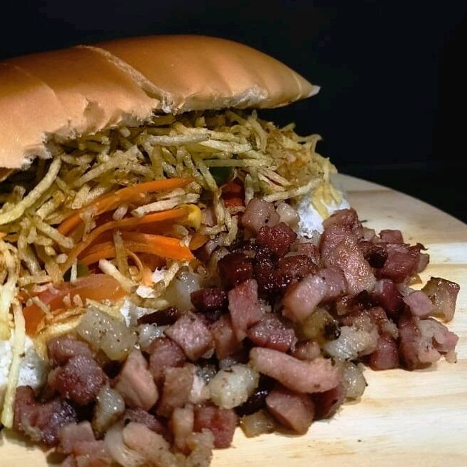 Pão,2 vinas,bacon em cubos, nossa deliciosa maionese caseira, catchup, farofa, milho, tomate, cebola, pimentão,cenoura e batata palha