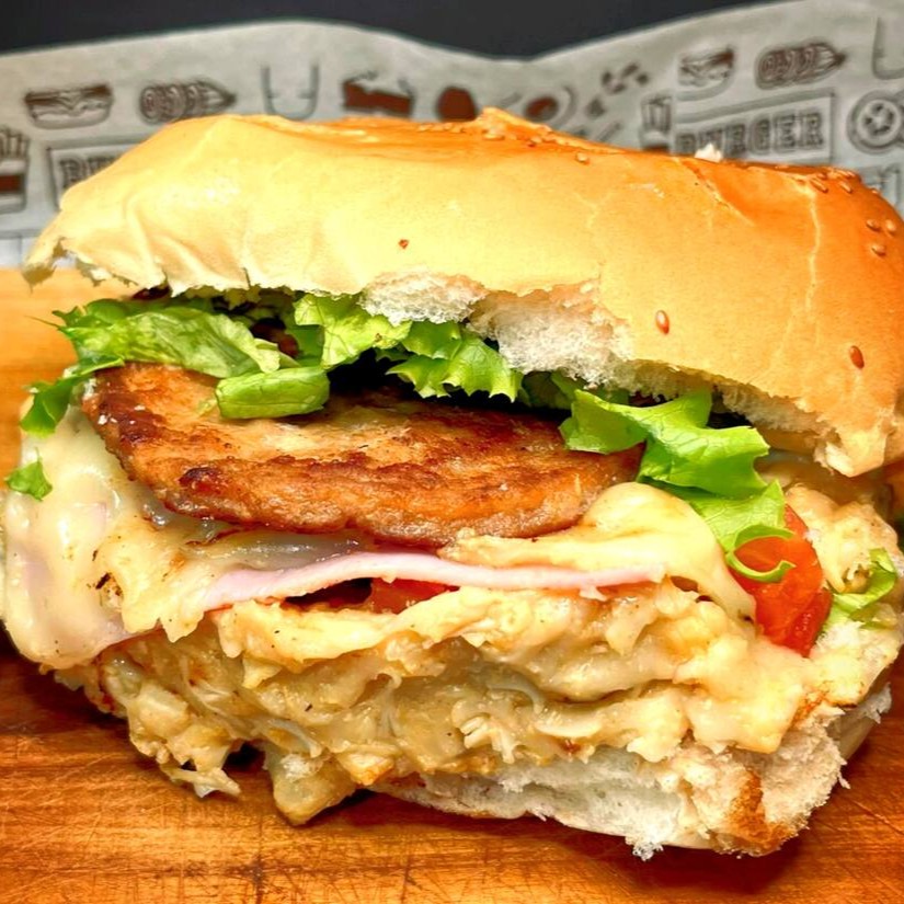 Pão , nossa deliciosa maionese caseira , catchup , hambúrguer 90g , queijo , presunto , tomate , alface , frango