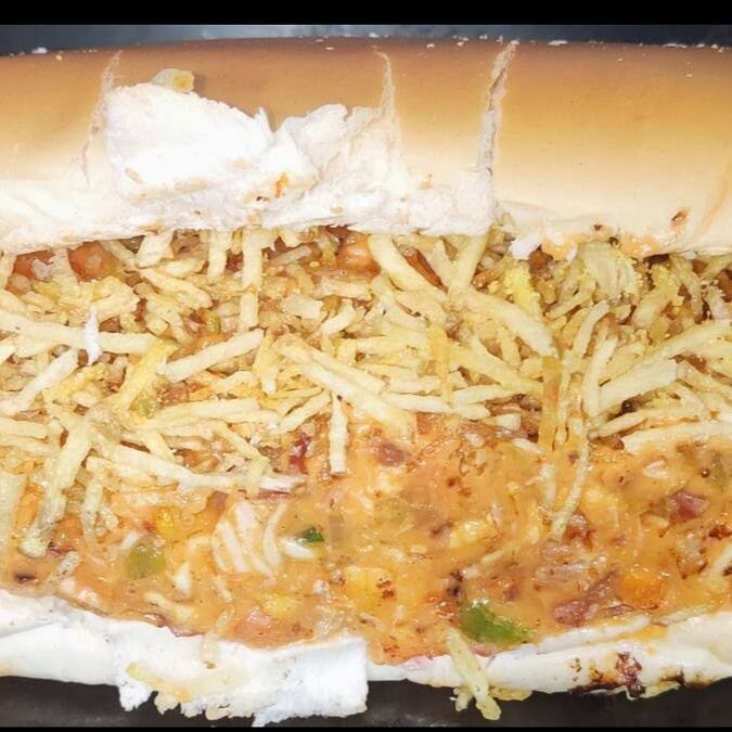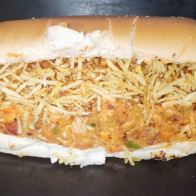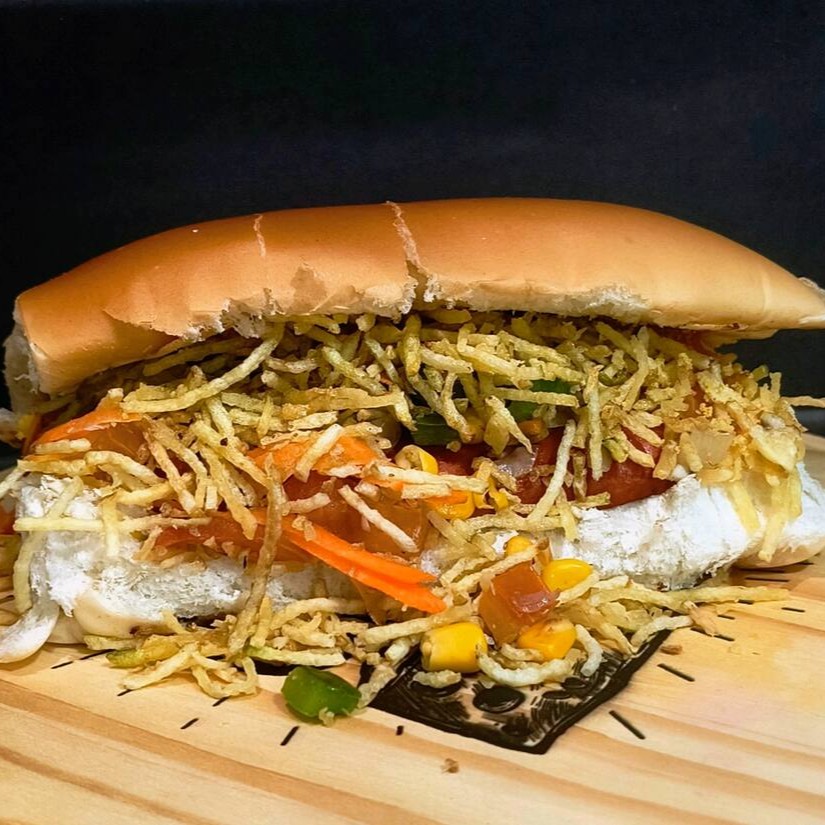 Pão,1 vina, calabresa em cubos, nossa deliciosa maionese caseira, catchup, farofa, milho, tomate, cebola, pimentão,cenoura e batata palha