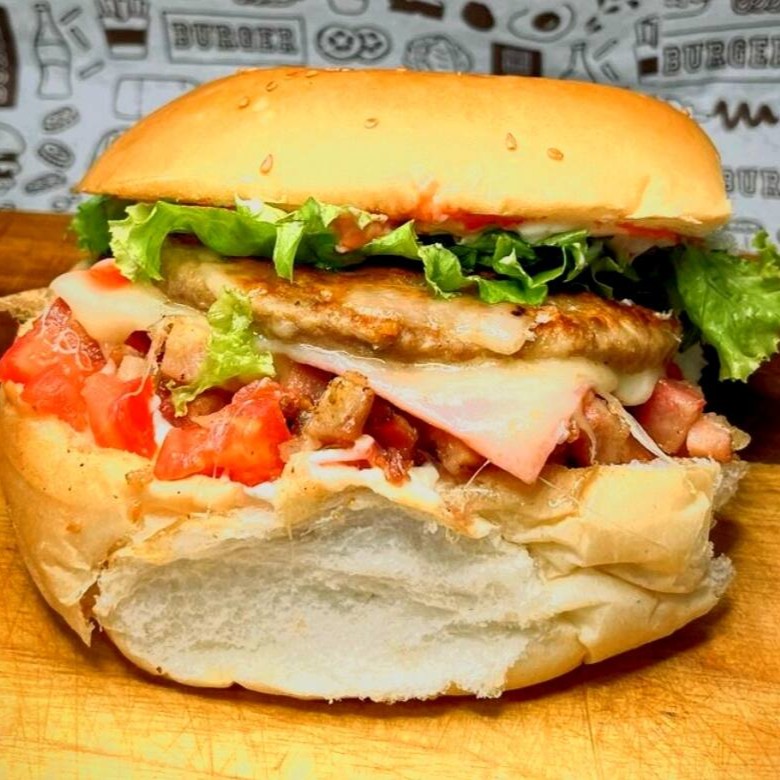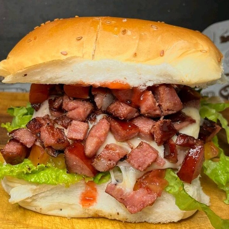 Pão , nossa deliciosa maionese caseira , catchup , hambúrguer 90g , queijo , presunto , tomate , alface , bacon