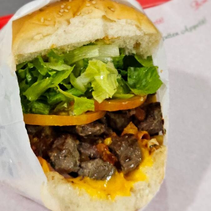 Pão, maionese, tomate e cebola na chapa com a alcatra (150gr aproximadamente), batata palha e Philadelphia.