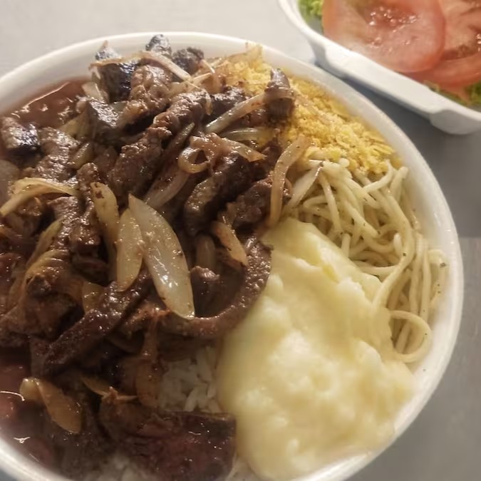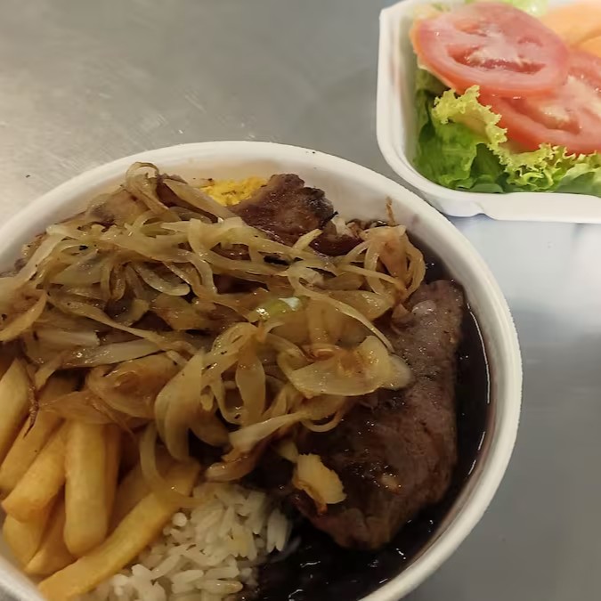 Uma marmita média com um delicioso bife de colchão mole grelhado na chapa com cebolas, acompanhada de arroz soltinho, feijão a sua escolha (por nas observações), macarrão alho e óleo, nossa deliciosa farofa da casa feita de farinha de milho, batatinha frita e uma salada fresquinha enviada a parte. (foto real)