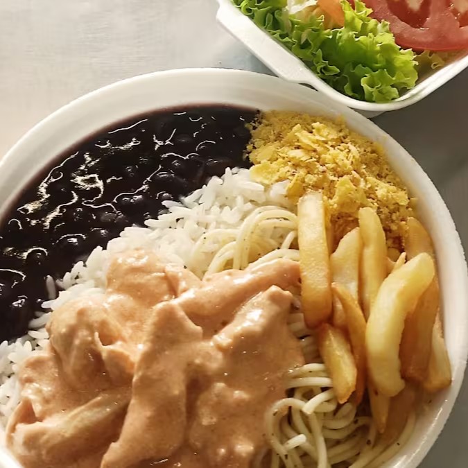 Uma deliciosa marmita média com nosso Strogonoff de Frango cremoso, acompanhada de arroz soltinho, feijão a sua escolha (por nas observações), macarrão alho e óleo, nossa deliciosa farofa da casa feita de farinha de milho, batatinha frita e uma salada fresquinha enviada a parte. (foto real)