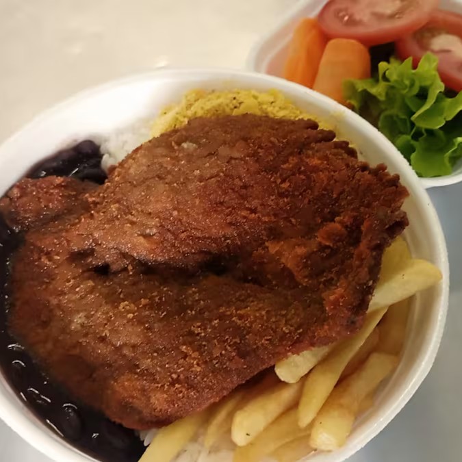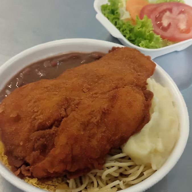 Uma deliciosa marmita média com um bife de colchão mole empanado e frito, acompanhada de arroz soltinho, feijão a sua escolha (por nas observações), macarrão alho e óleo, nossa deliciosa farofa da casa feita de farinha de milho, batatinha frita e uma salada fresquinha enviada a parte. (foto real)