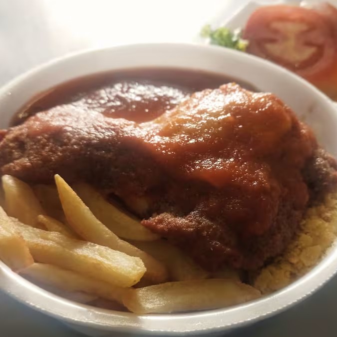 Uma deliciosa marmita média com nosso Bife a Parmegiana, um bife macio, empanado e frito, com queijo mussarela e molho ao sugo! Acompanhada de batatas frita e arroz soltinho! (foto real)