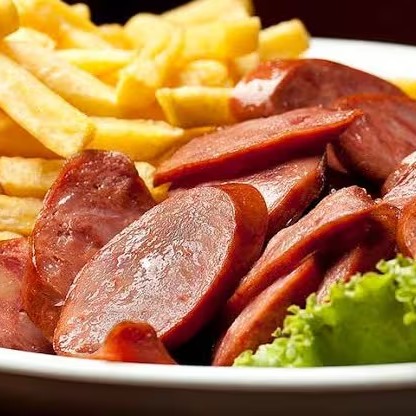 Deliciosa porção de batata frita acompanhada de calabresa acebolada. Acompanha molho caseiro.