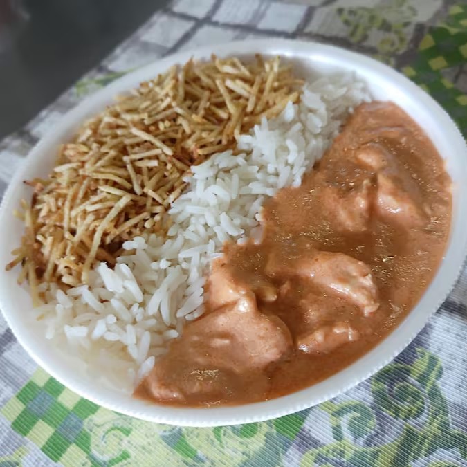 Uma deliciosa marmita média com nosso Strogonoff de Frango super cremoso, acompanhada de batata palha crocante e arroz soltinho! (foto real)