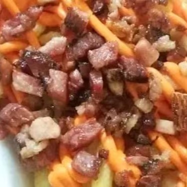 450 gramas de batatas fritas com cheddar cremoso e bacon em cubos. Caso prefira Catupiry informe nas observações.