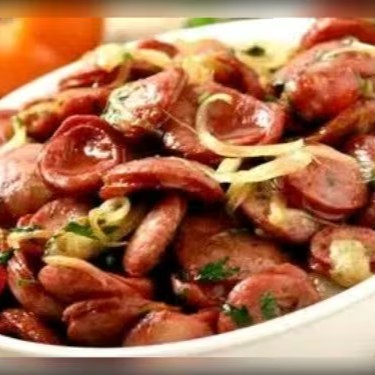 500 gramas de calabresa fatiada preparada na chapa com cebolas.