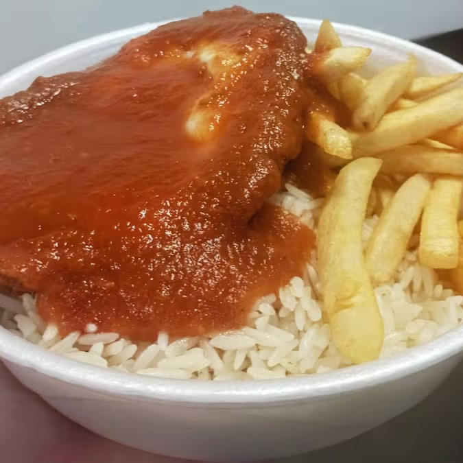 Uma deliciosa marmita média com nosso Frango a Parmegiana, um filé de peito macio, empanado e frito, com queijo mussarela e molho ao sugo! Acompanhada de batatas frita e arroz soltinho! (foto real)