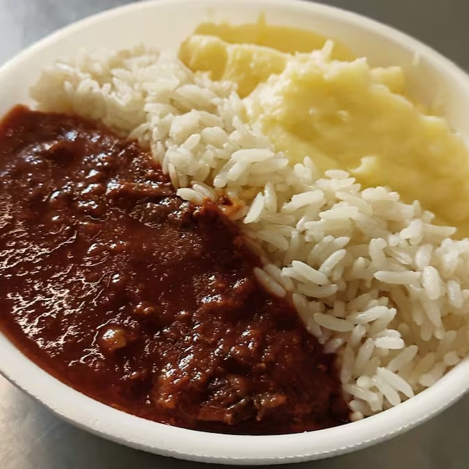Uma deliciosa marmita média com nossa Carne de Panela super macia, feita com Patinho e Colchão mole de primeira qualidade! Acompanhada de batatas frita e arroz soltinho! (foto real)