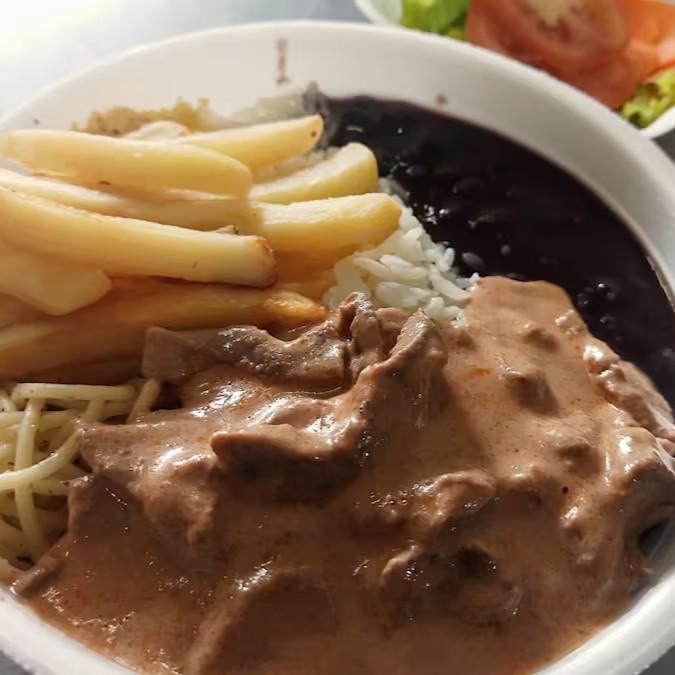 Uma deliciosa marmita média com nosso Strogonoff de Carne Cremoso, acompanhada de arroz soltinho, feijão a sua escolha (por nas observações), macarrão alho e óleo, nossa deliciosa farofa da casa feita de farinha de milho, batatinha frita e uma salada fresquinha enviada a parte. (foto real)