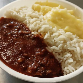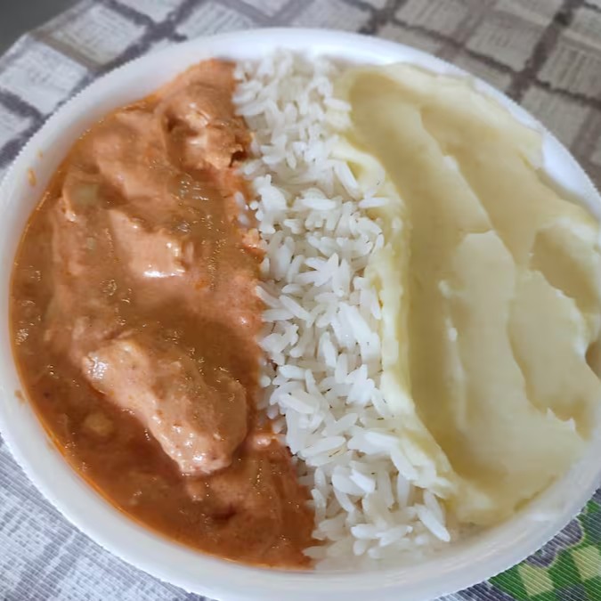 Uma deliciosa marmita média com nosso Strogonoff de Frango super cremoso, acompanhada de purê de batatas cremoso e arroz soltinho! (foto real)