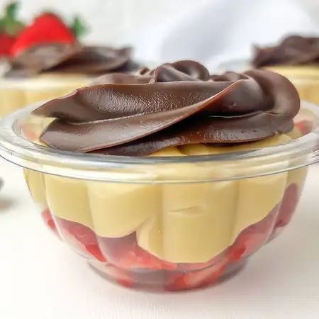 Recheio cremoso de chocolate super aveludado e morangos fresquinhos e selecionados picados.
