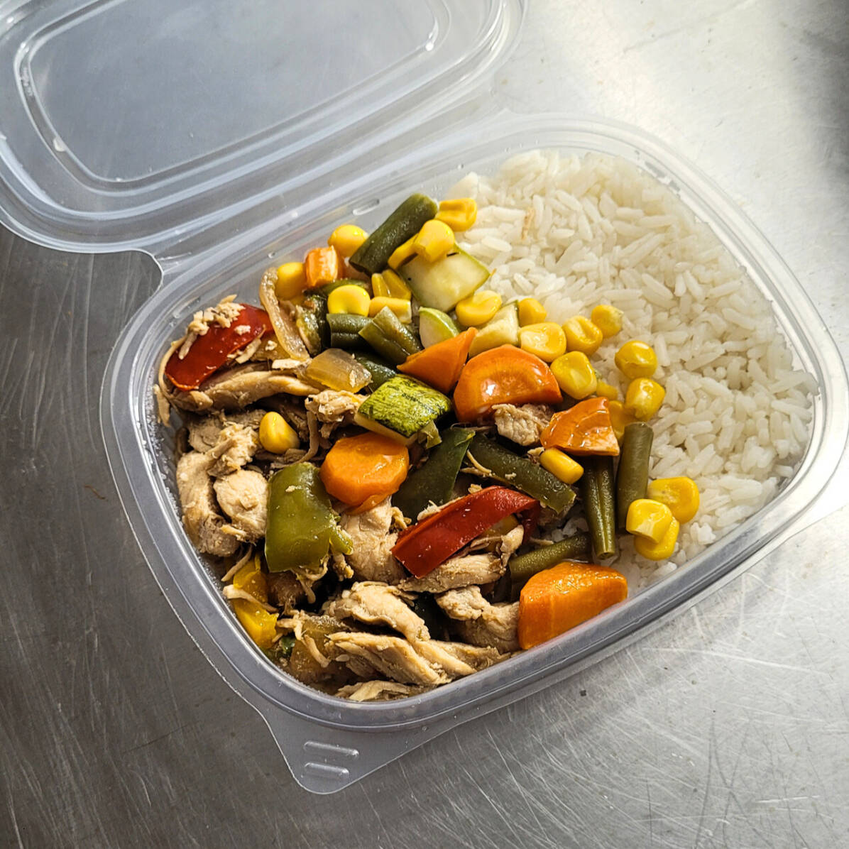 Strogonoff de frango cremoso (~120g), arroz branco e batatas douradas. Marmita pronta contendo 400 gramas. Não é possível alterar ou remover itens!