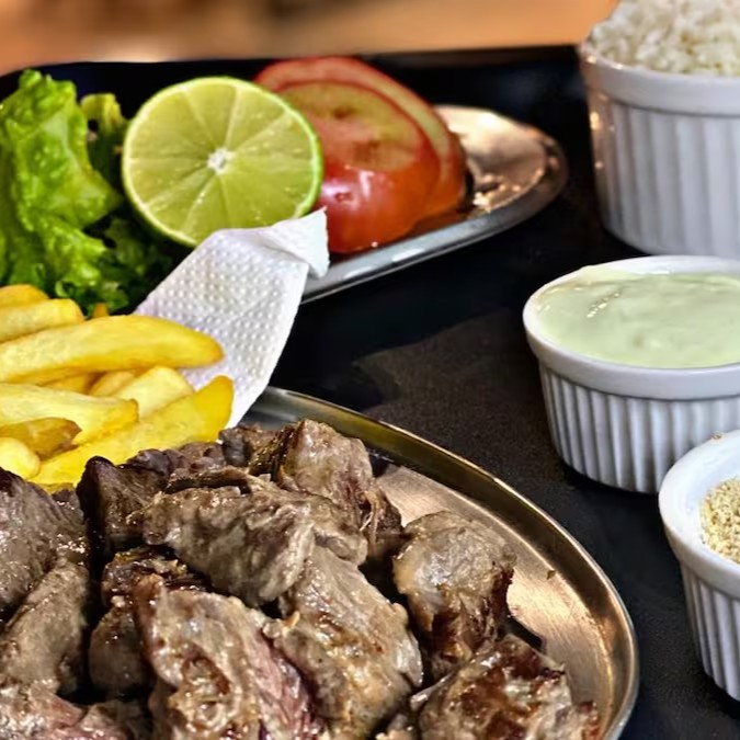 Mignon em cubos, arroz, batata frita, salada, farofa, molho de alho.