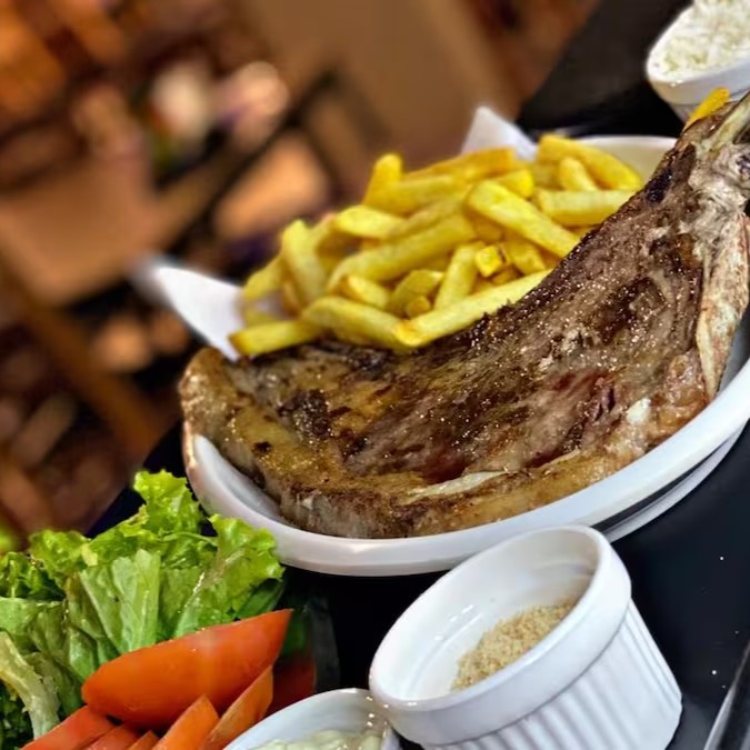 Chuleta na chapa, arroz, batata frita, salada, farofa, molho de alho.
