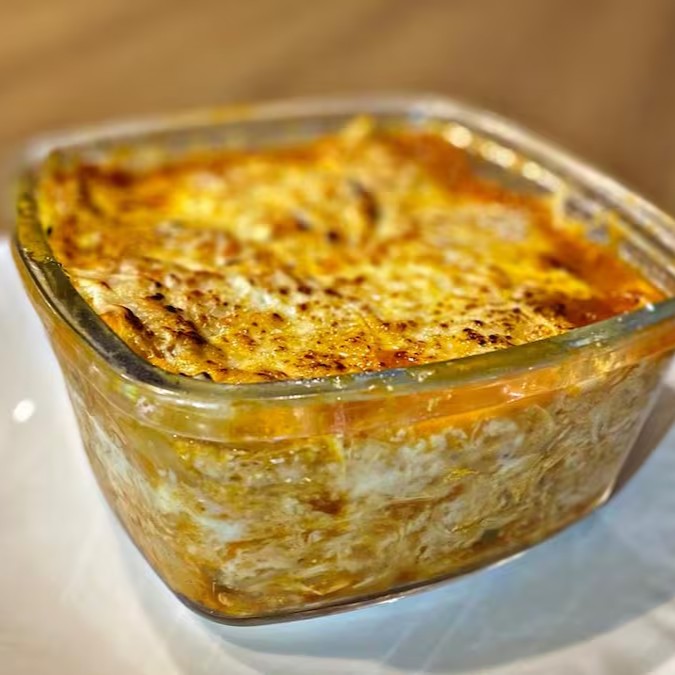 Massa de lasanha, molho branco, mussarela, parmesão, provolone, Catupiry.