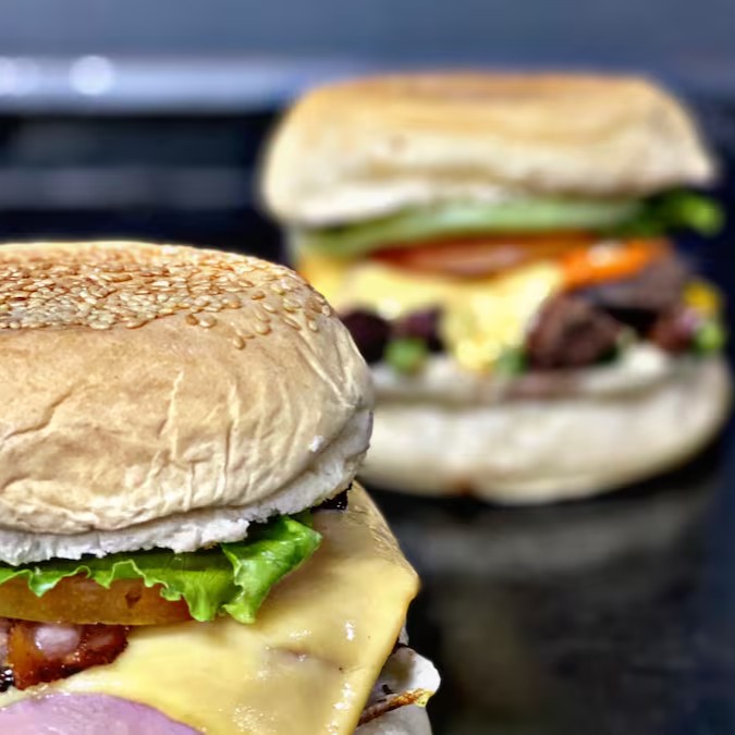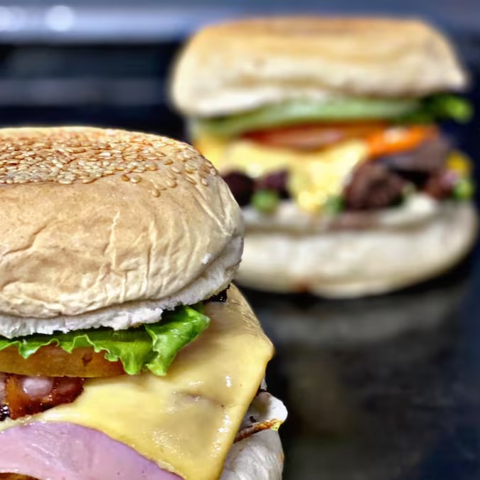 Alface americana, bacon, calabresa, cheddar, frango, hambúrguer artesanal 120g, maioneses, mussarela, ovo, pão, presunto e tomate.