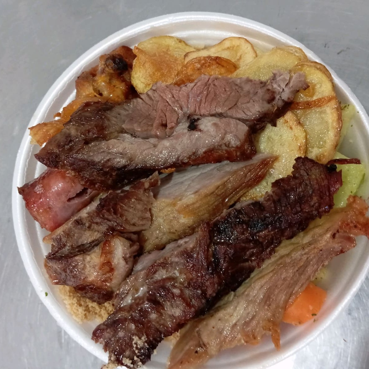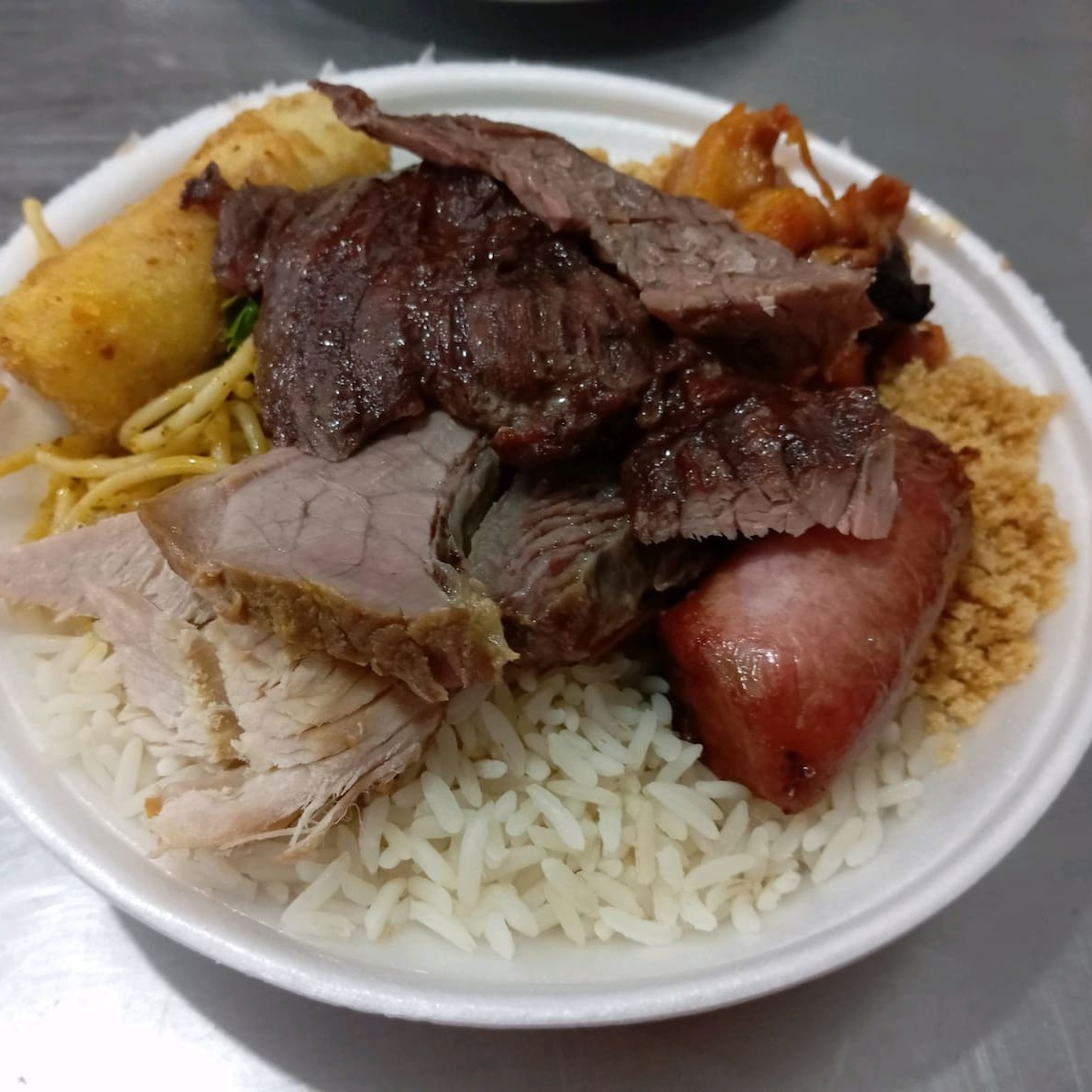Arroz, feijão, macarrão, refogado do Dia, farofa três fatias de carne, um frango e uma linguiça.