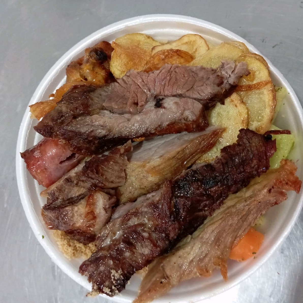 Arroz, feijão,macarrão farofa, fritura do Dia refogado,3 fatias de carne 1 linguiça 1 frango.