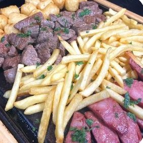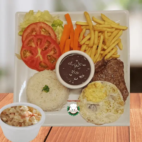Acompanha 1 filé de Alcatra Arroz, Feijão, Fritas e Salada