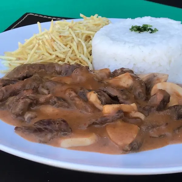 Deliciosa combinação de tirinhas de alcatra suaves, cogumelos frescos e molho cremoso, servida com arroz branco e batata palha crocante.