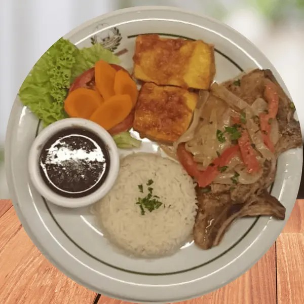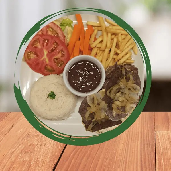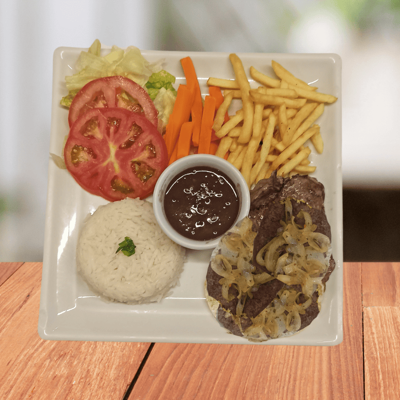 Bife acebolado suculento Arroz branquinho soltinho Feijão bem temperado Batata frita crocante Salada fresca